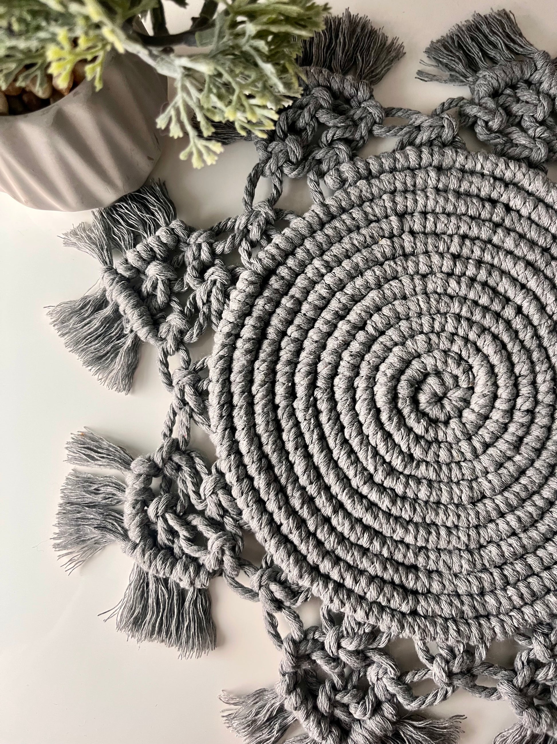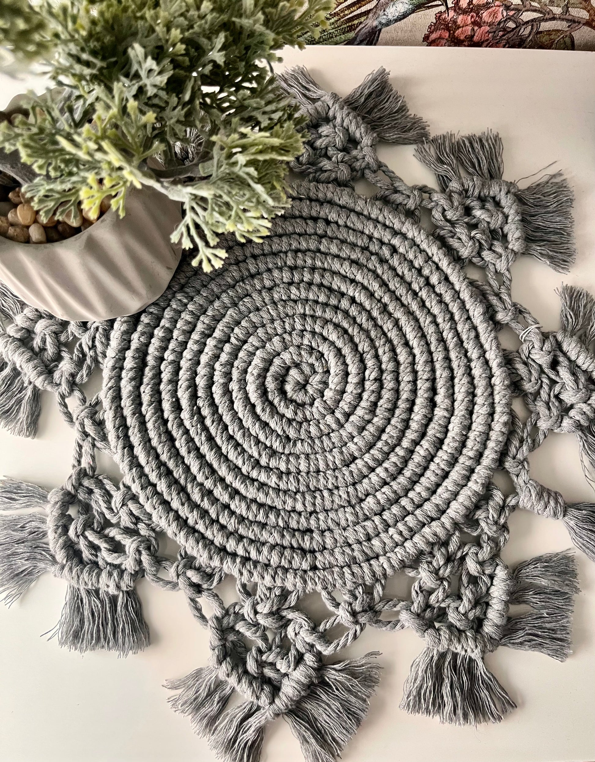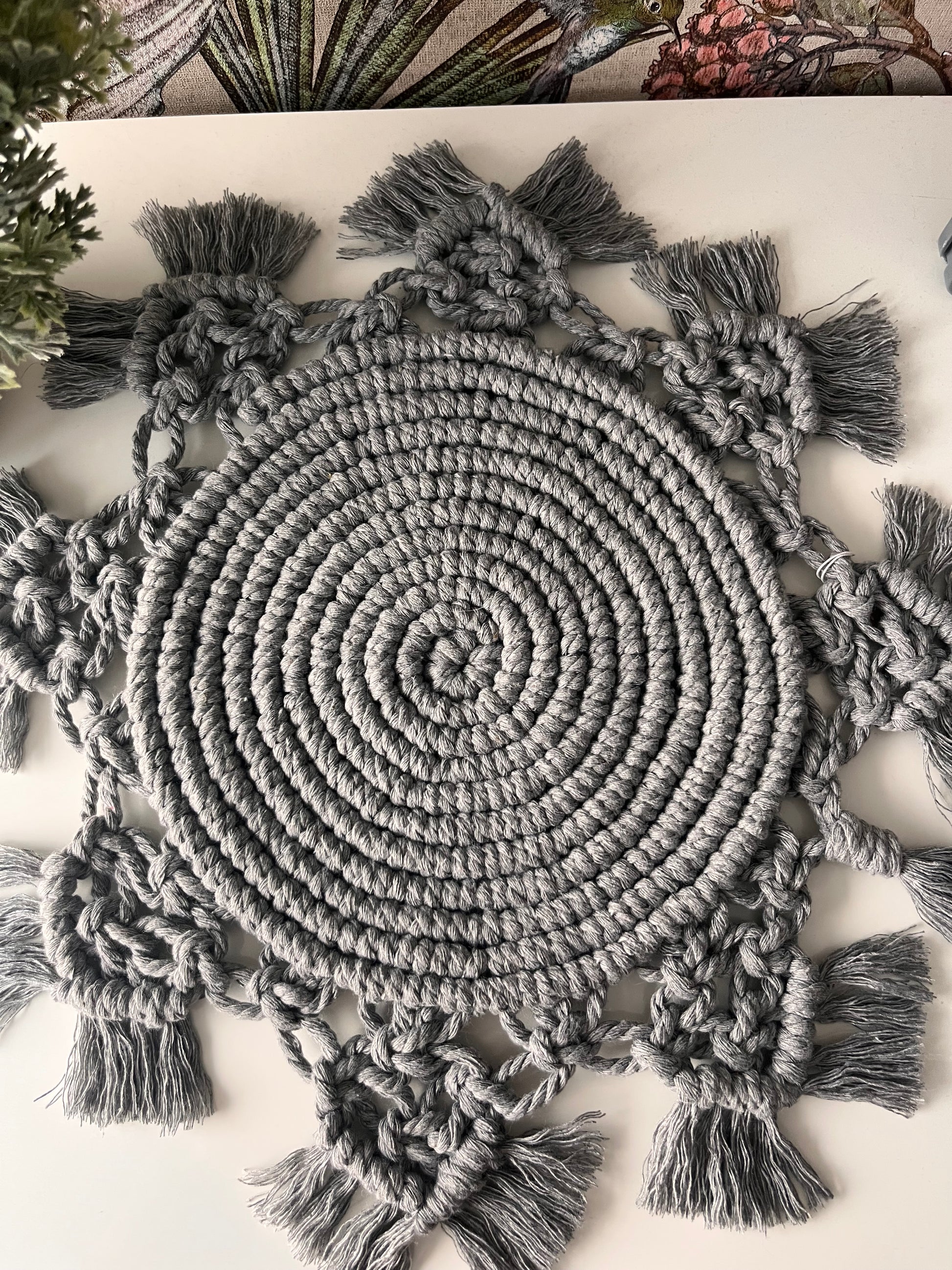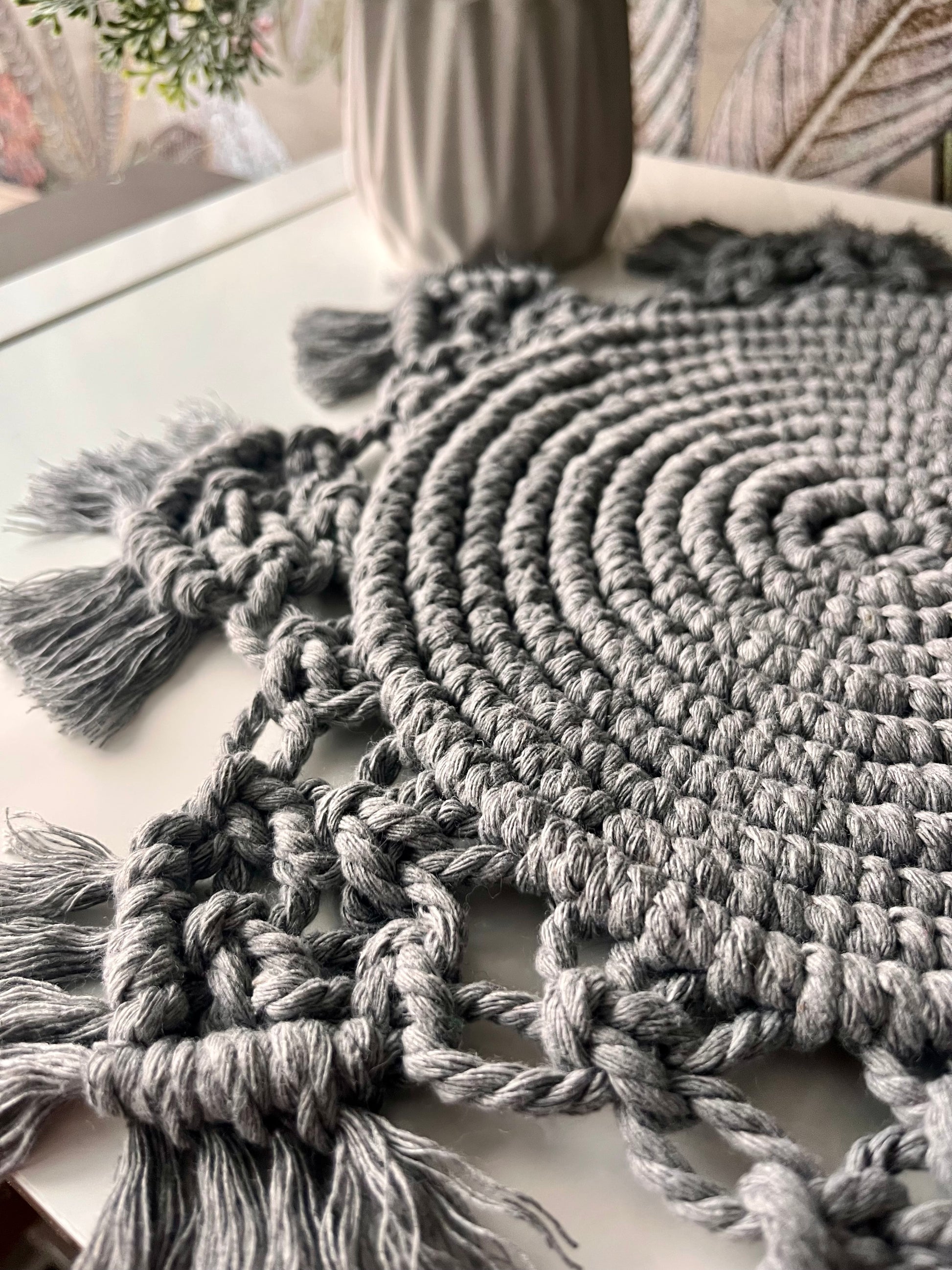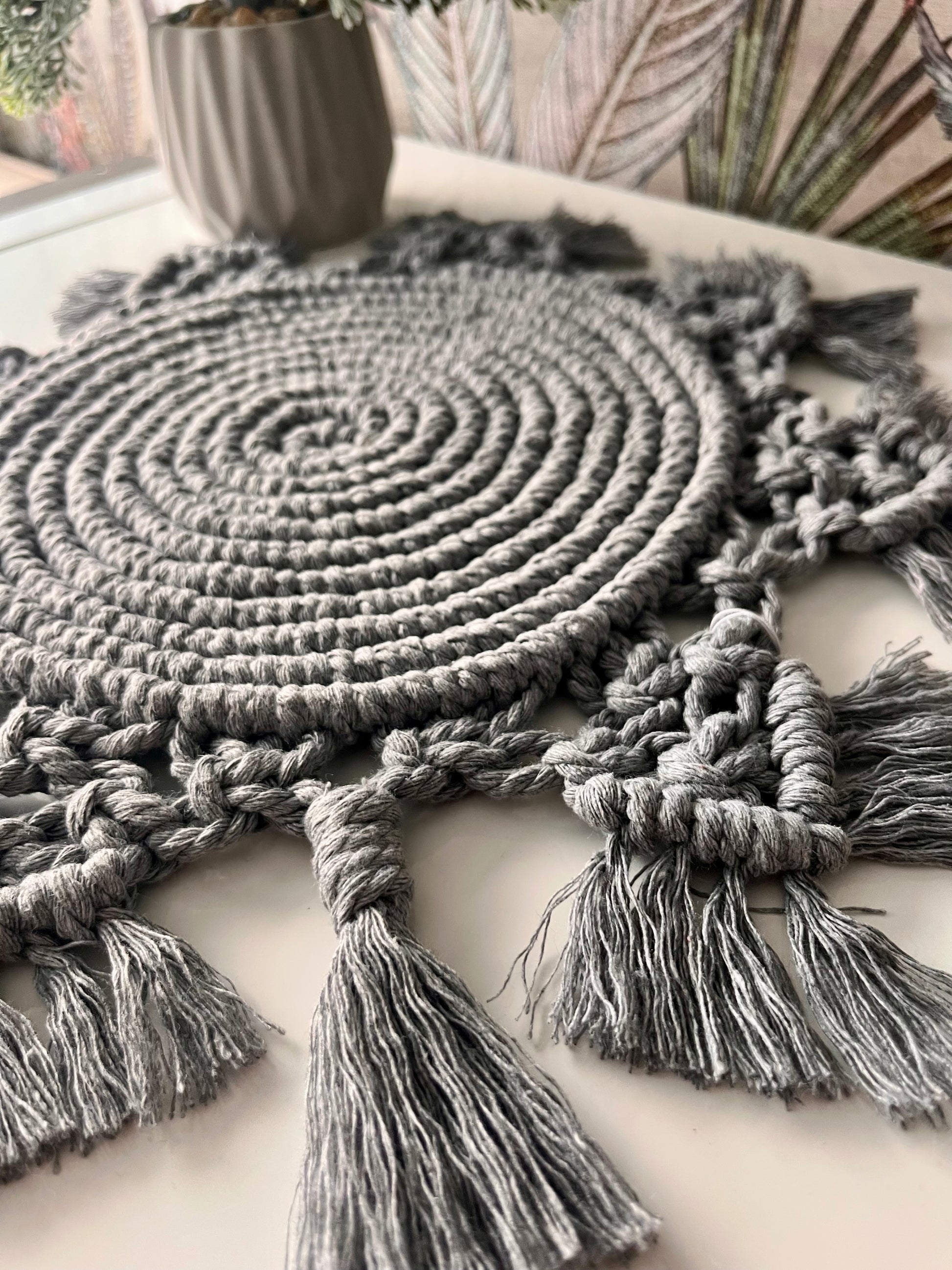 Stilingas ir jaukus macramé padėkliukas, rištas iš tvirtos medvilninės virvės. Puikiai tinka, kaip interjero akcentas. Boho stiliaus kutai suteikia išskirtinumo, o universali pilka spalva dera prie bet kokio interjero.